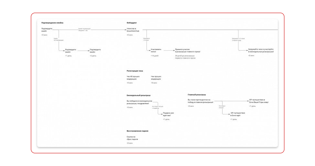 Для быстрого запуска важно было согласовать первые рассылки: письма онбординга и технические письма о загрузке чеков. Затем мы перешли к мотивирующим и информационным письмам о победах в розыгрышах.