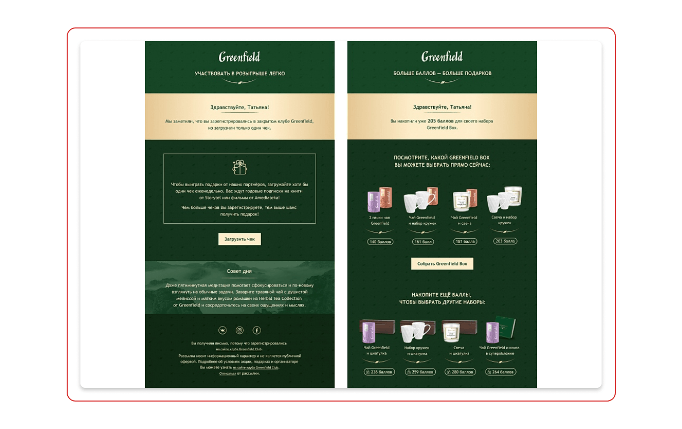 На левом скриншоте пример рассылки тем, кто загрузил только один чек, с напоминанием о розыгрыше еженедельных подарков. На правом — тем, кто загрузил больше двух чеков с рассказом о наборах Greenfield Box
