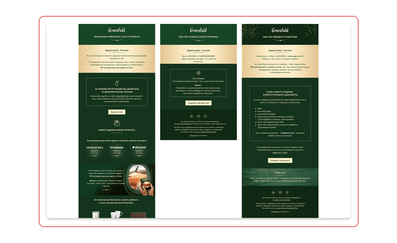 Для участия в промо покупателям нужно было регистрировать чеки из супермаркетов на специальном сайте. Во время акции участники получали письма от Greenfield: мотивирующие, технические и информационные о выигрыше.