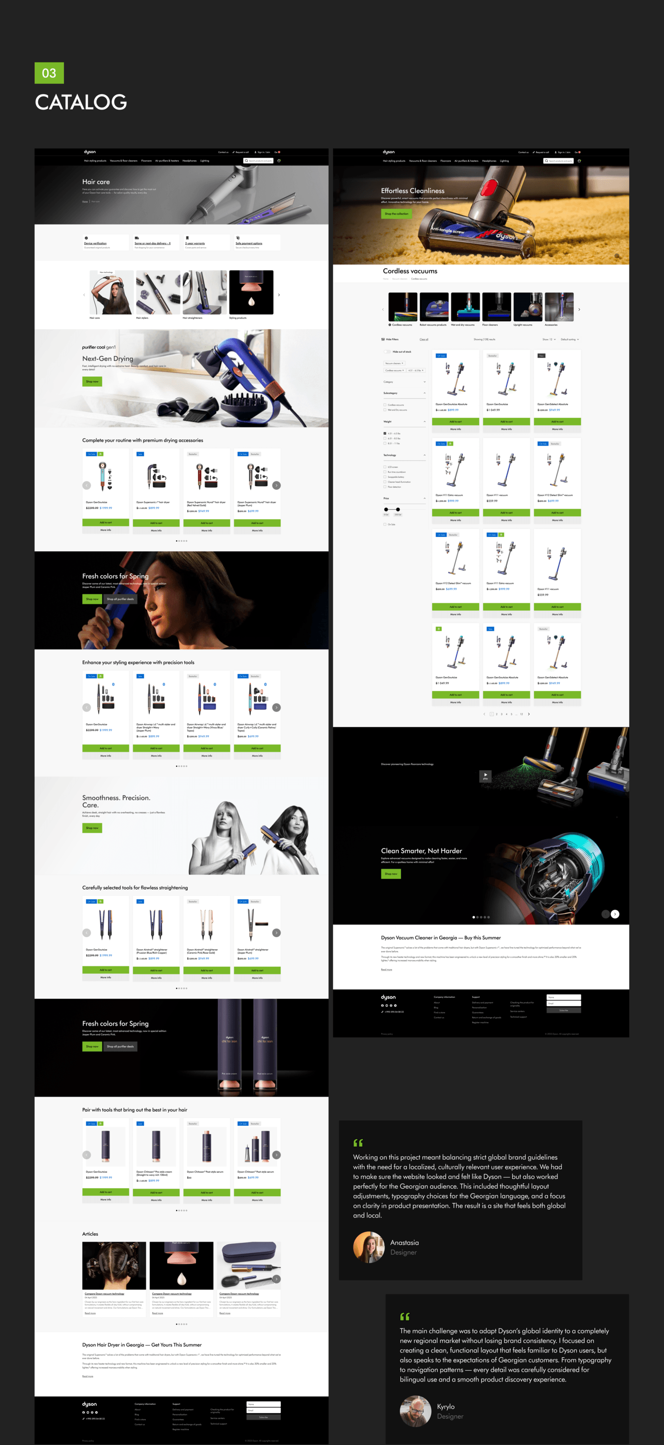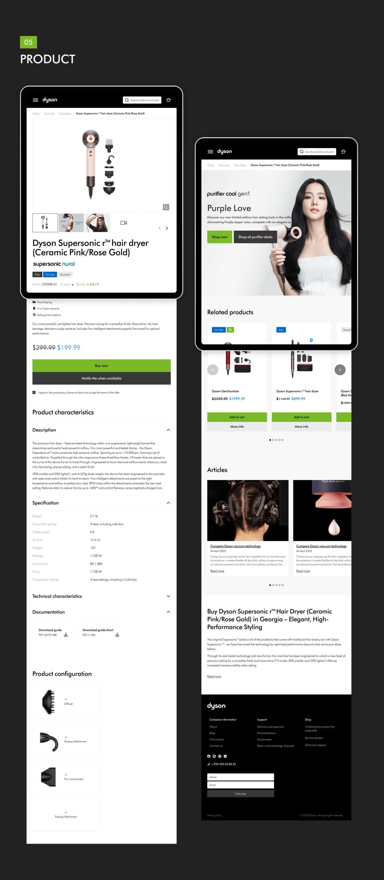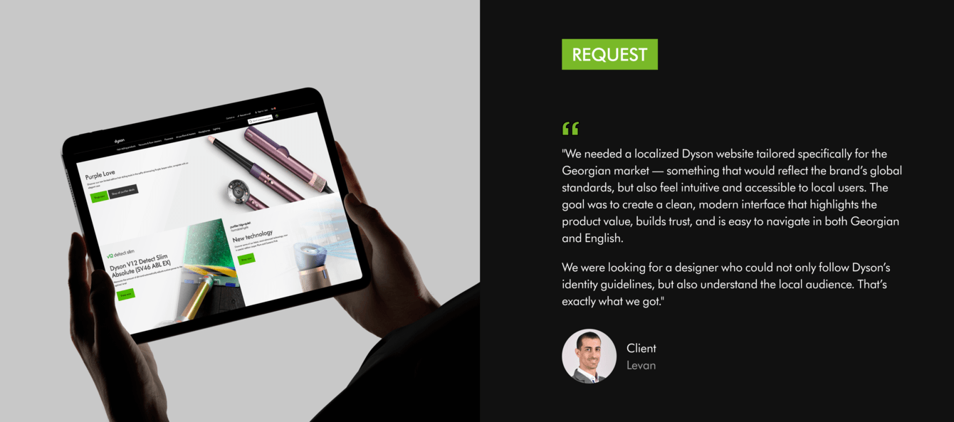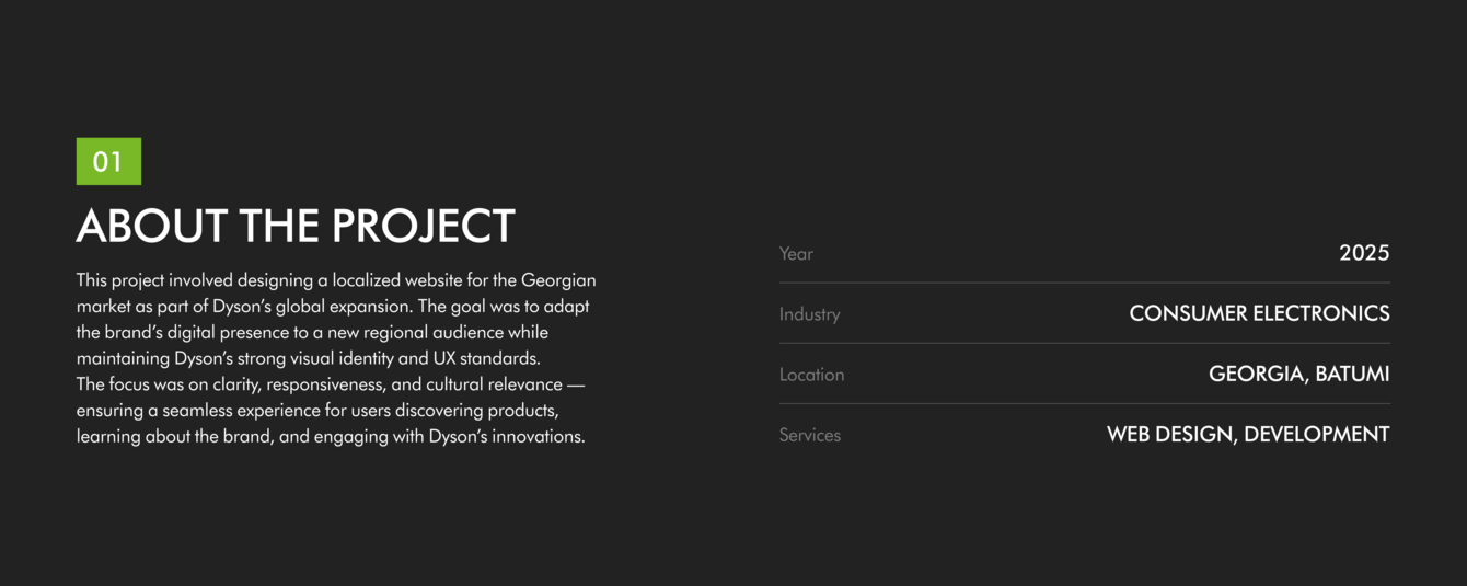Мы проанализировали эталонный dyson.com, адаптировали UX под WooCommerce, для удобной модерации сайта силами команды без привлечения подрядчиков, заложили фундамент для масштабирования на другие страны и быструю MVP-публикацию.