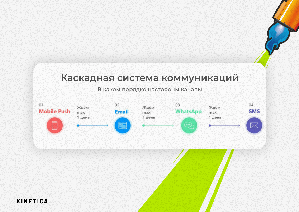 Так, сначала направляли клиенту оффер через канал с минимальной стоимостью — email или пуш. Если не было реакции, переводили в другой, более дорогой канал — SMS или WhatsApp — до тех пор, пока не было зафиксировано взаимодействие.