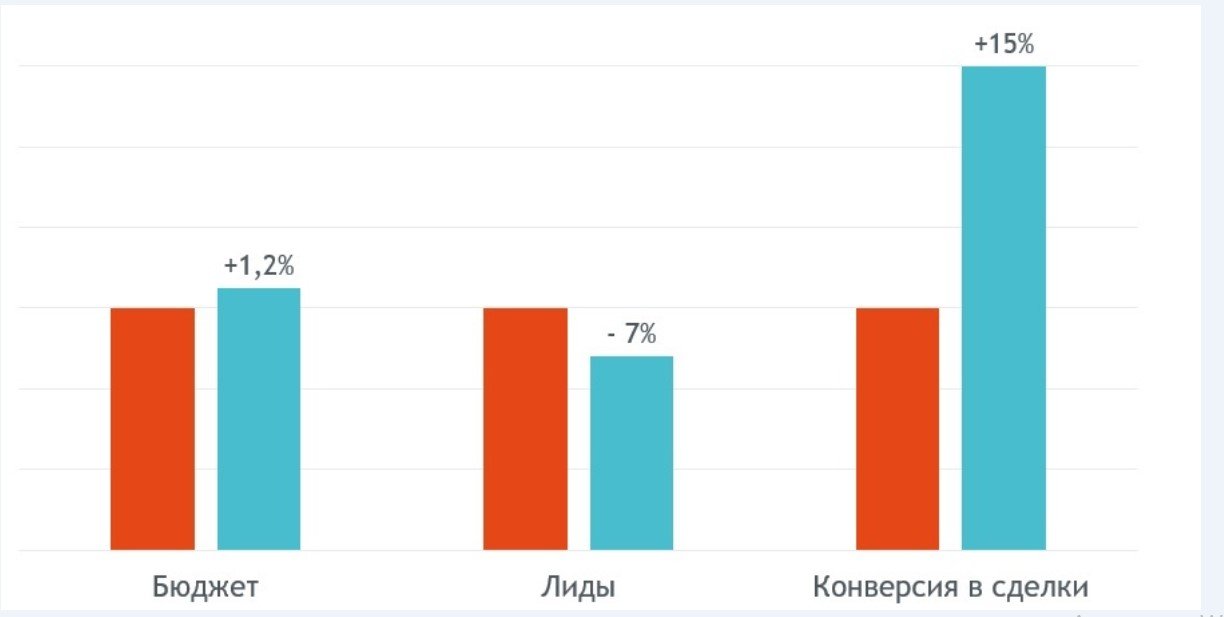 Управление рекламой на основе статистики лидов и «созданных сделок» позволило повысить эффективность. При том же рекламном бюджете количество полученных лидов снизилось на 7%, при этом количество созданных сделок повысилось на 15%.