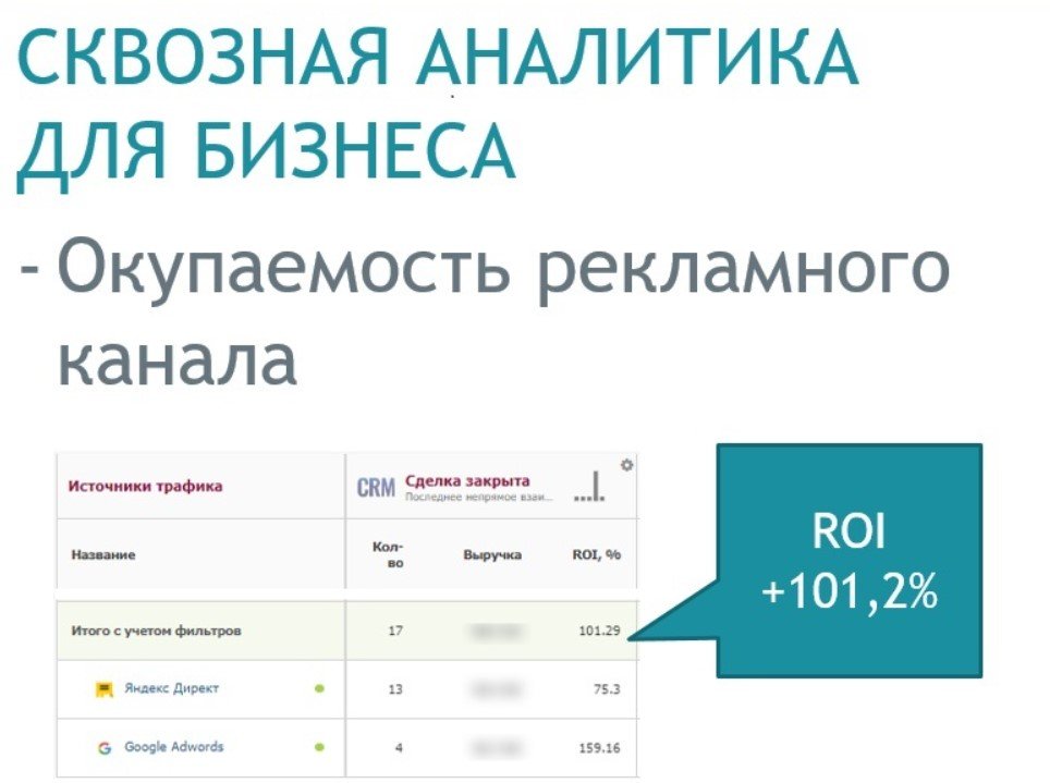 После завершения настроек подключения и накопления статистики получили наглядный отчет по всем рекламным кампаниям, в котором отражены: затраты на рекламные активности, число лидов, количество закрытых сделок и объем продаж. Выяснили, что окупаемость рекламы составляет +101 %.