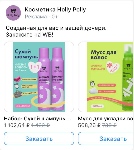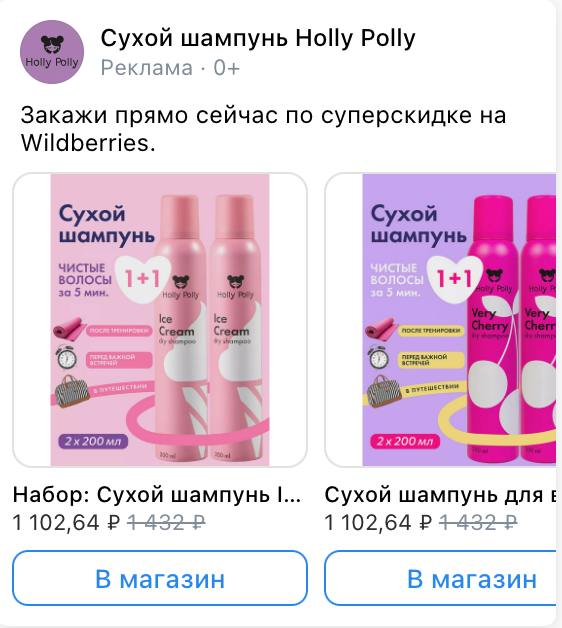 Результат не заставил себя ждать. Путем тестирования выявили, что карусель товаров является самым эффективным инструментом для продвижения потому что большое количество карточек в одной рекламе позволяет шире охватить интересы пользователей и повышает вероятность добавления в корзину любого продукта бренда Holly Polly.