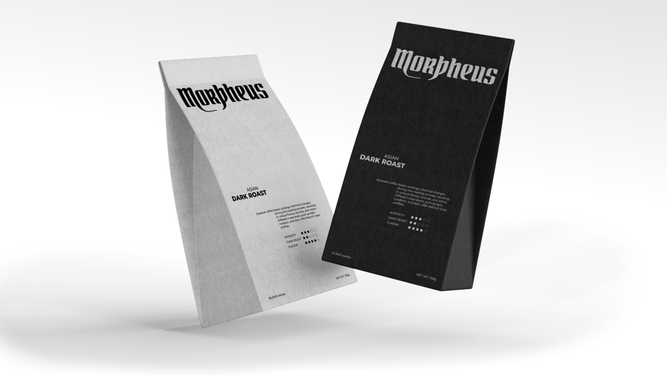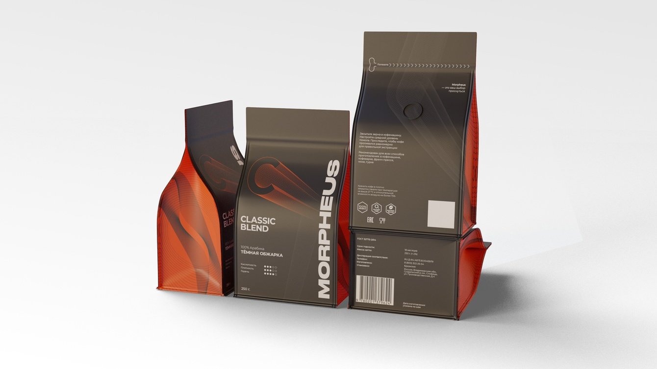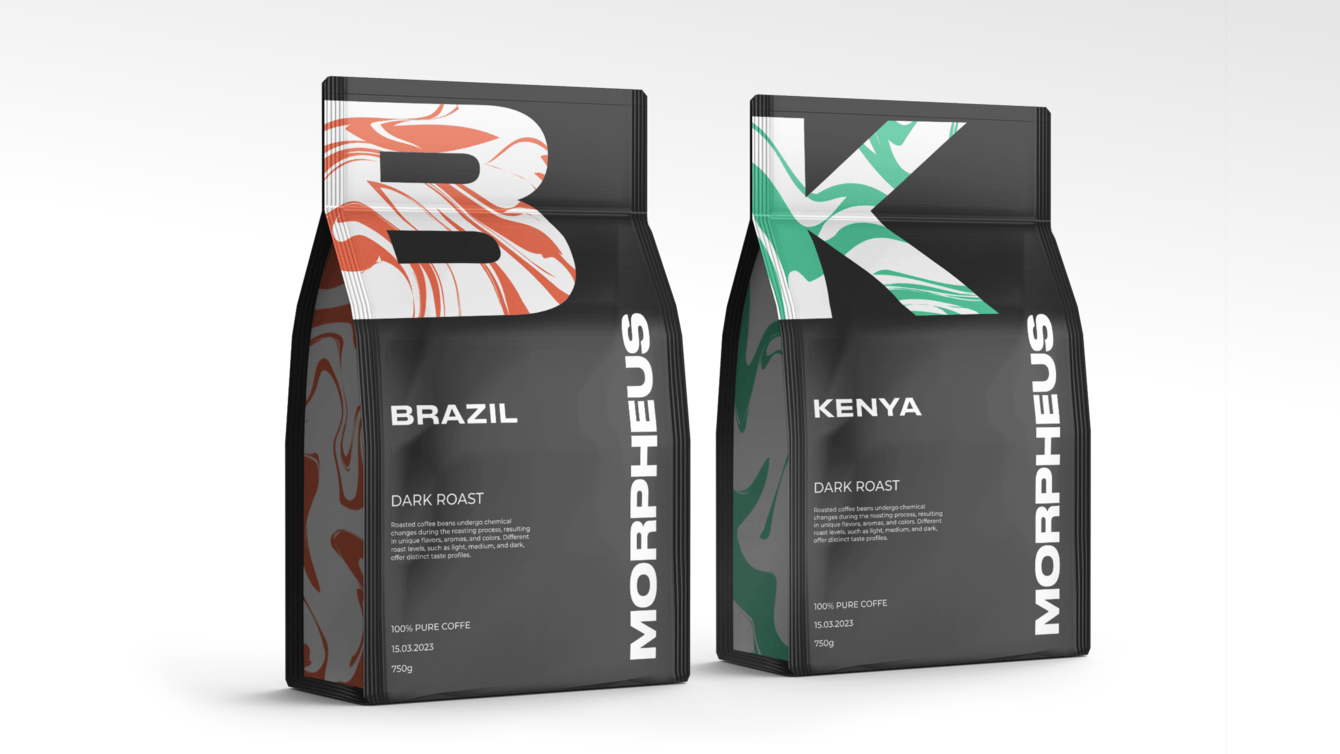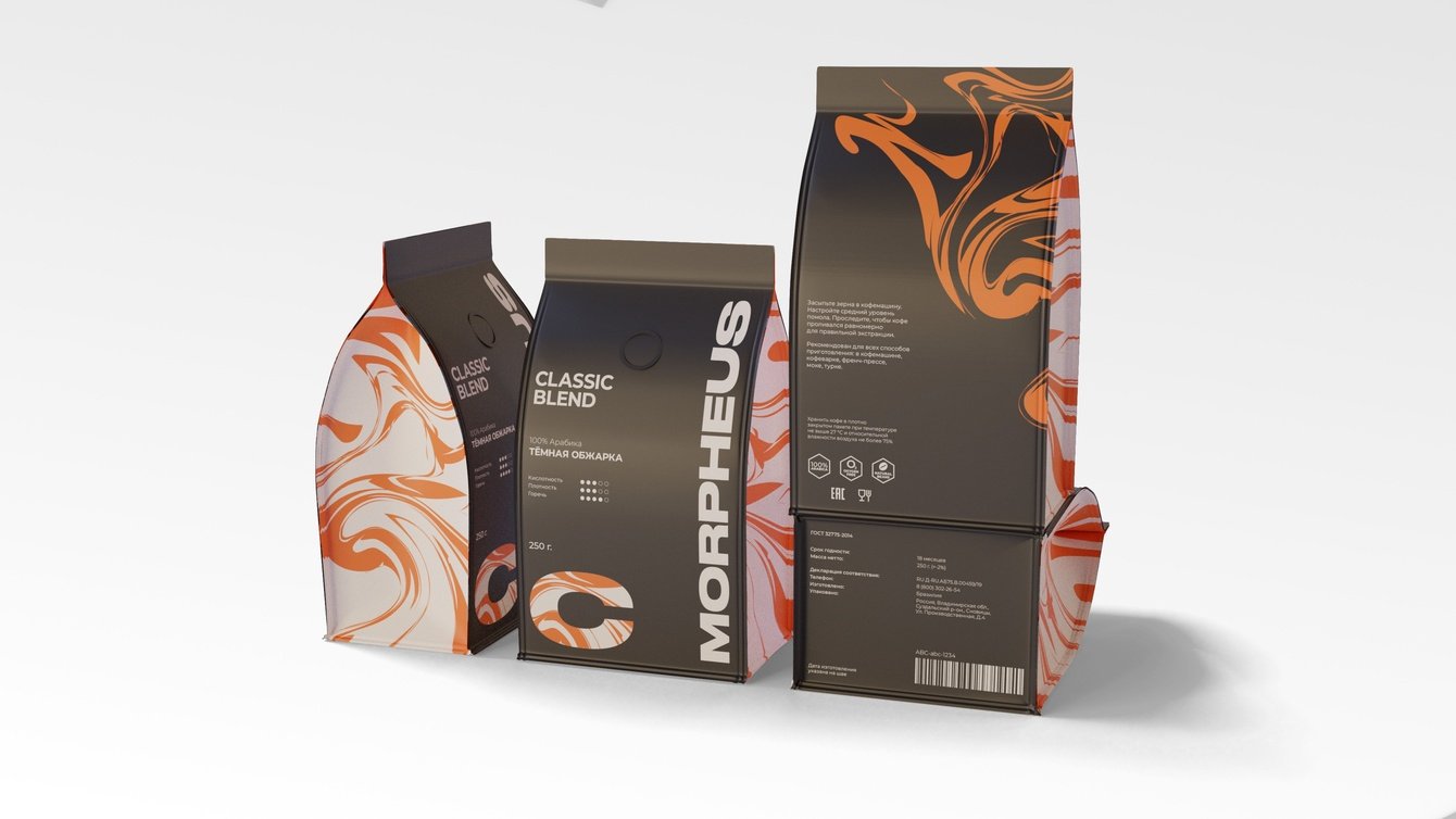 Морфинг — это визуальный эффект, когда один объект плавно трансформируется в другой. Он созвучен с названием бренда, поэтому мы решили не просто разместить заглавную букву, а оригинально преподнести её. Плюс этот элемент продолжается и на других сторонах упаковки. А боковые, как и в предыдущей концепции — акцентные, отражают тип смеси.
