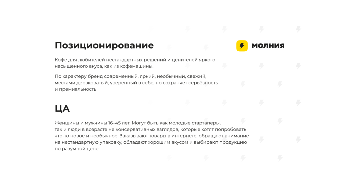 Всё это помогло сформировать у заказчика более чёткое понимание будущего образа продукта: «Кофе для любителей нестандартных решений и ценителей яркого насыщенного вкуса, как из кофемашины». По характеру бренд современный, яркий, местами дерзкий, уверенный в себе, но сохраняет серьёзность и премиальность.