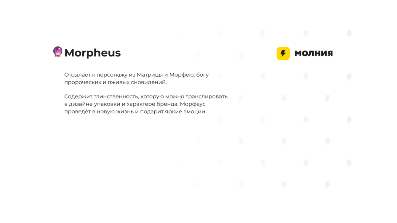 Среди 8 названий клиент выбрал Morpheus. Оно отсылает к Морфею — богу пророческих сновидений, и персонажу из Матрицы — Морфеусу. Каждый сможет найти в этом названии свой смысл.