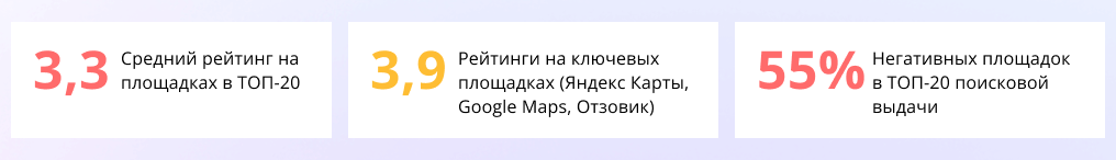 Итак, когда клиент обратился в наше агентство, ситуация для компании была критической. На Яндекс.Картах, Google Maps и Отзовике оценки колебались в районе 3,9–4,0, то есть ниже уровня, который воспринимается клиентами как «надёжный». Более того, если брать остальные площадки с отзывами о компании, то средний рейтинг и вовсе держался на уровне 3,3 балла. В поисковой выдаче ситуация выглядела ещё хуже: 55% ссылок приходились на площадки с негативом.