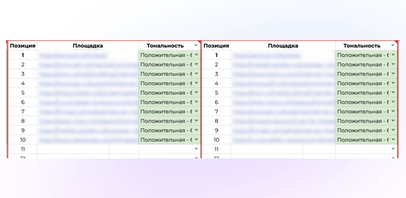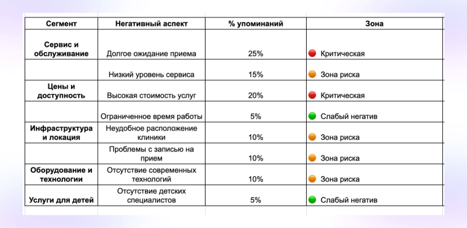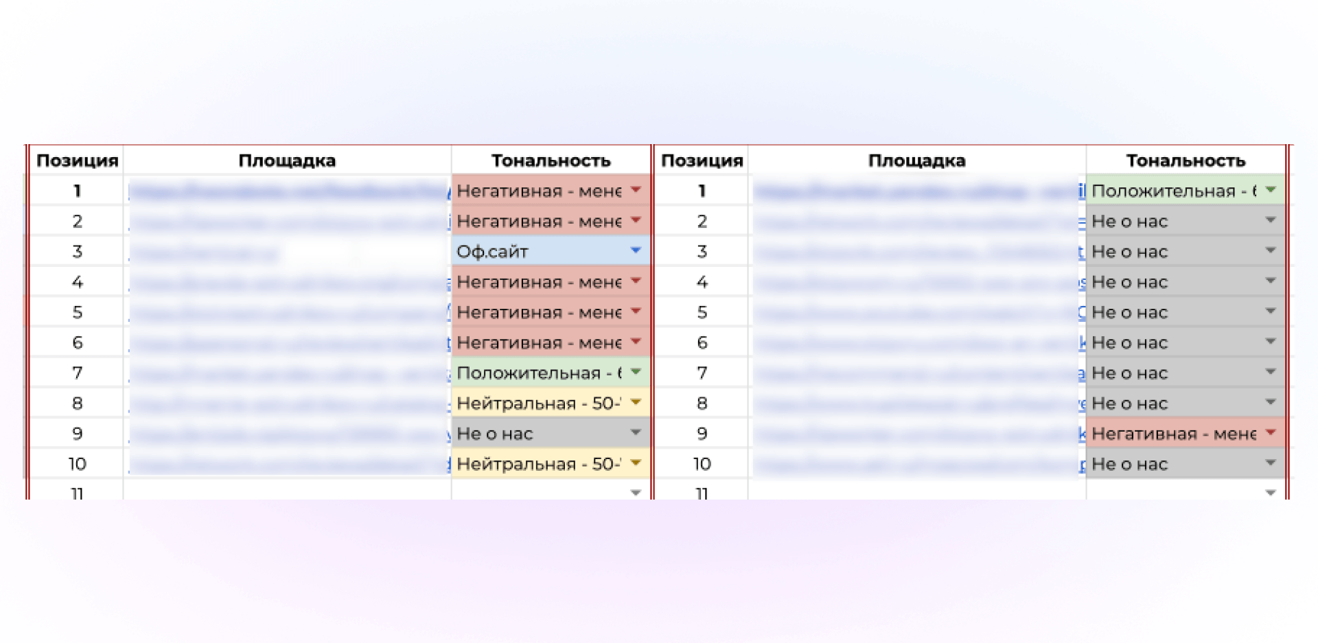 Поэтому первым нашим шагом стало внедрение глобального мониторинга. Мы настроили отслеживание ТОП-20 результатов по 10 ключевым запросам и запустили ежедневный экспресс-мониторинг наиболее активных площадок. Это позволило видеть картину в реальном времени и чётко понимать, где клинику «бьют» сильнее всего. Параллельно мы провели анализ негативных триггеров — и сразу выявили слабые места в сервисе и коммуникациях.