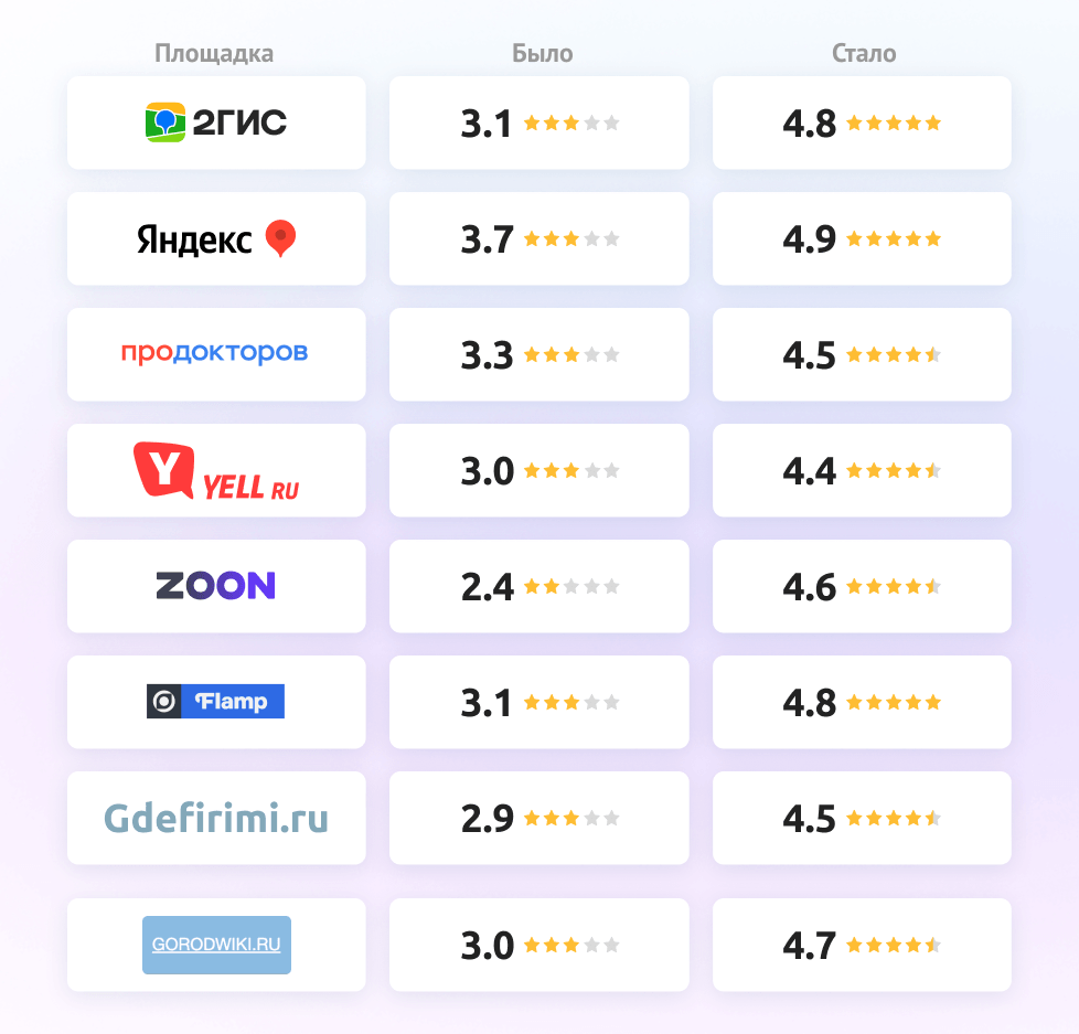 Результаты не заставили себя ждать. Всего за семь месяцев клиника смогла выйти из «зоны риска» со слабыми рейтингами и постоянным потоком негатива и закрепиться на уровне стабильных оценок 4,5–4,9.