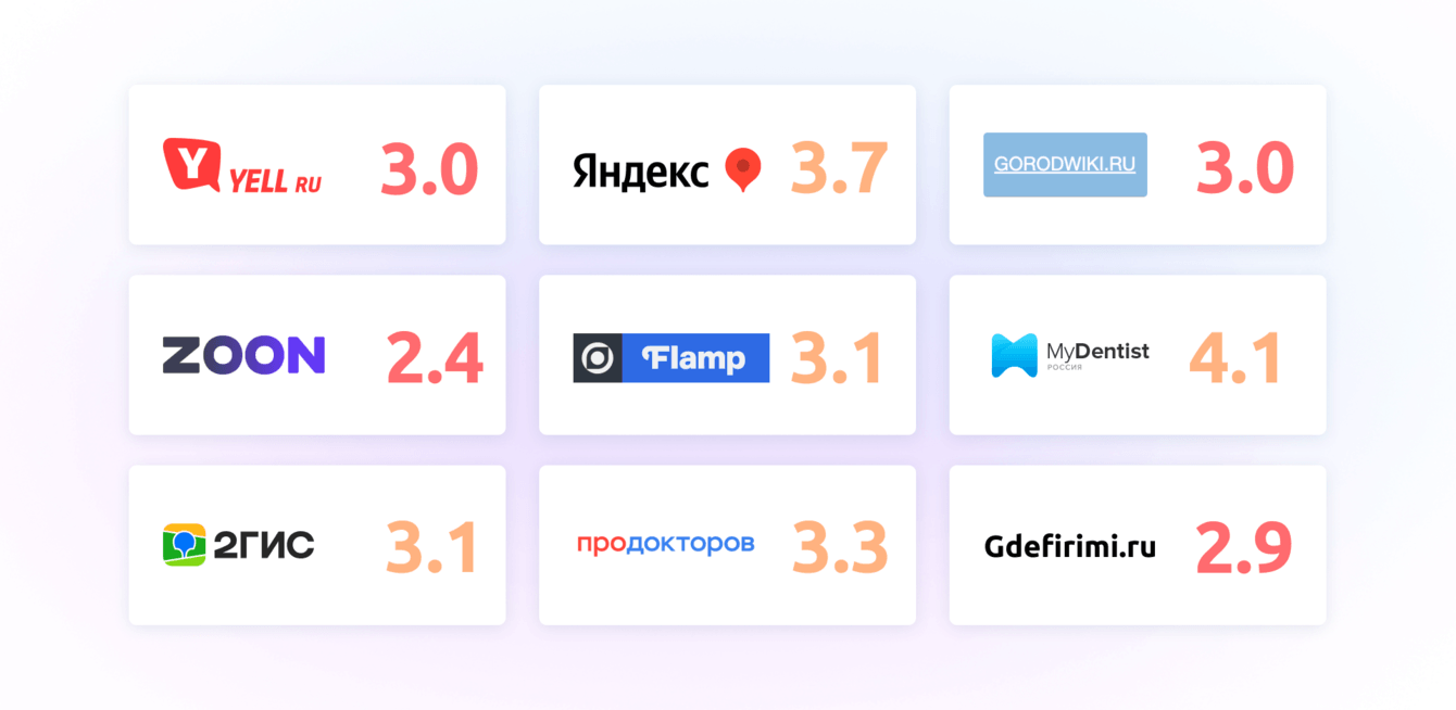 Когда мы начали разбирать ситуацию детальнее, картина оказалась ещё более тревожной. На ключевых площадках рейтинги стоматологии были откровенно слабыми: