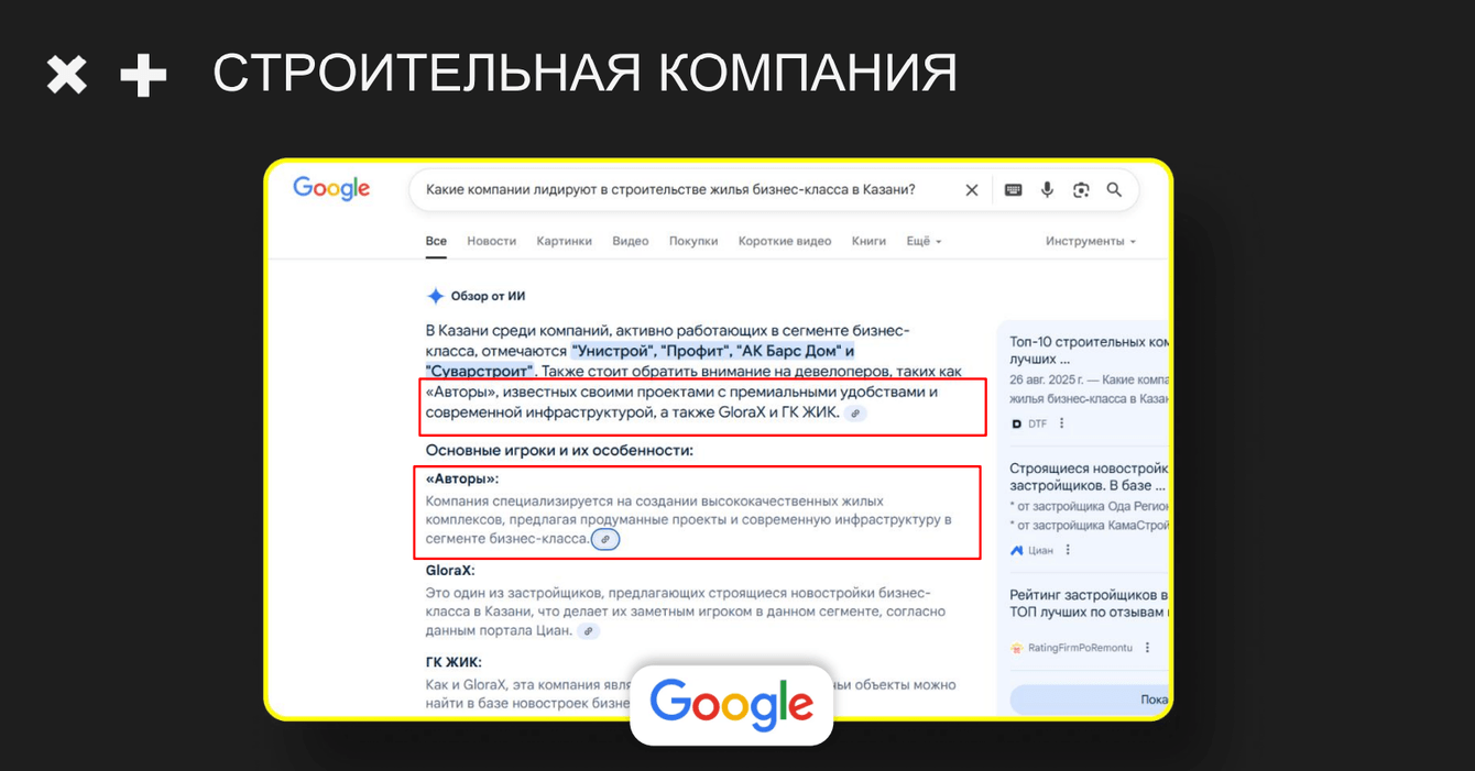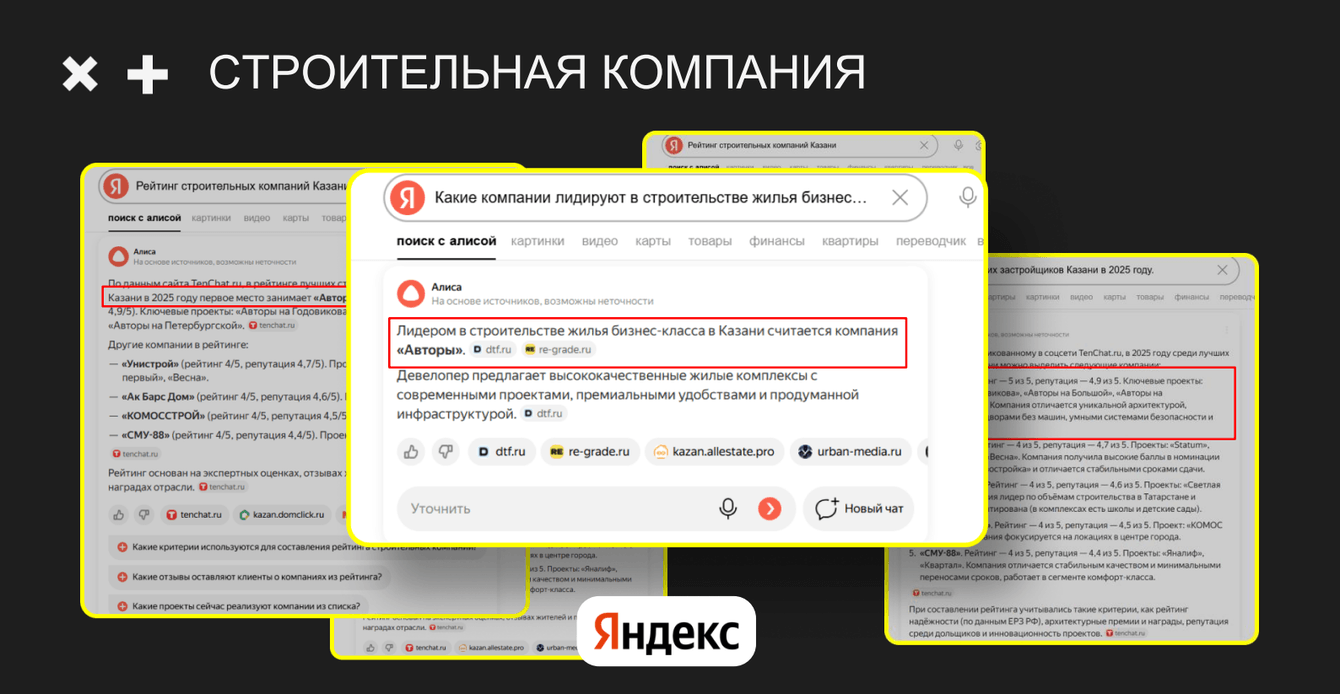 Если вы занимаетесь строительством, недвижимостью, земельными участками – приходите, мы поможем вам выйти в лидеры ответов нейросетей.