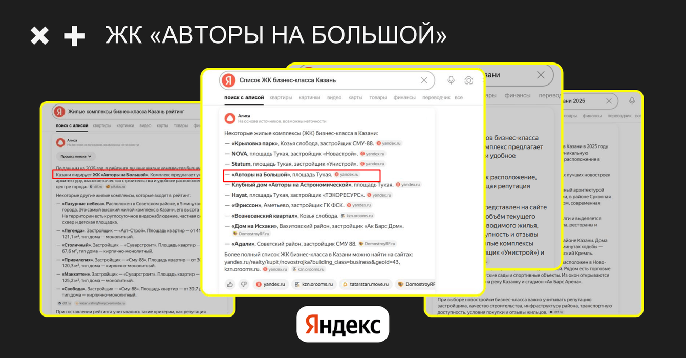- Обеспечили дистрибуцию контента: публикации на Vc, Дзене, DTF, Pikabu, тематических площадках, промо в Telegram, VK, Tenchat. Кстати, именно Тенчат у нас сработал очень классно, после первой же публикации прочно заняли ТОП ИИ Яндекс с Алисой по жирному запросу “Лучшие застройщики Казани”
