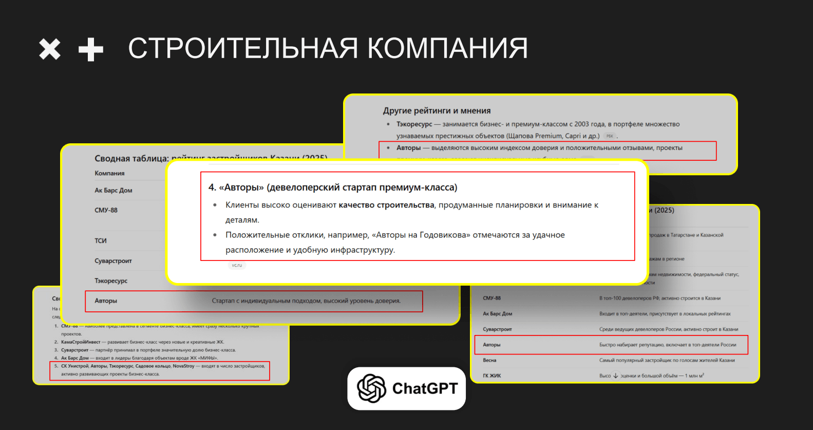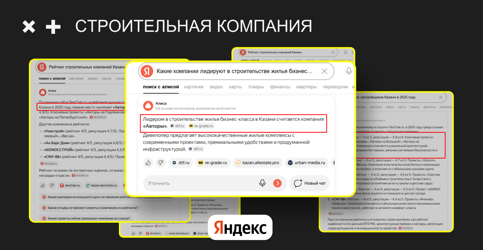 Если вы занимаетесь строительством, недвижимостью, земельными участками – приходите, мы поможем вам выйти в лидеры ответов нейросетей.