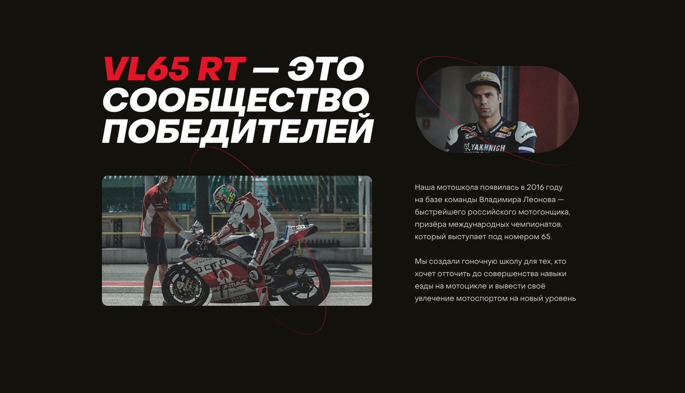 За новым лендингом к нам обратилась мотошкола VL65 Racing Team, где с 2016 года профессиональные гонщики готовятся к соревнованиям, а любители приобщаются к мототусовке.
