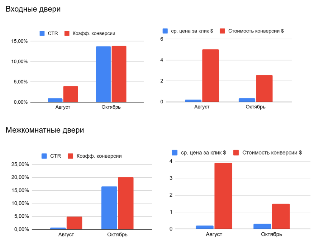 Для максимальной эффективности рекламы выбрали Google Ads, запустив кампании в поисковой и контекстно-медийной сетях. В первые две недели оценили результаты и разделили кампании на отдельные группы по категориям дверей: входные и межкомнатные. Провели следующие улучшения: