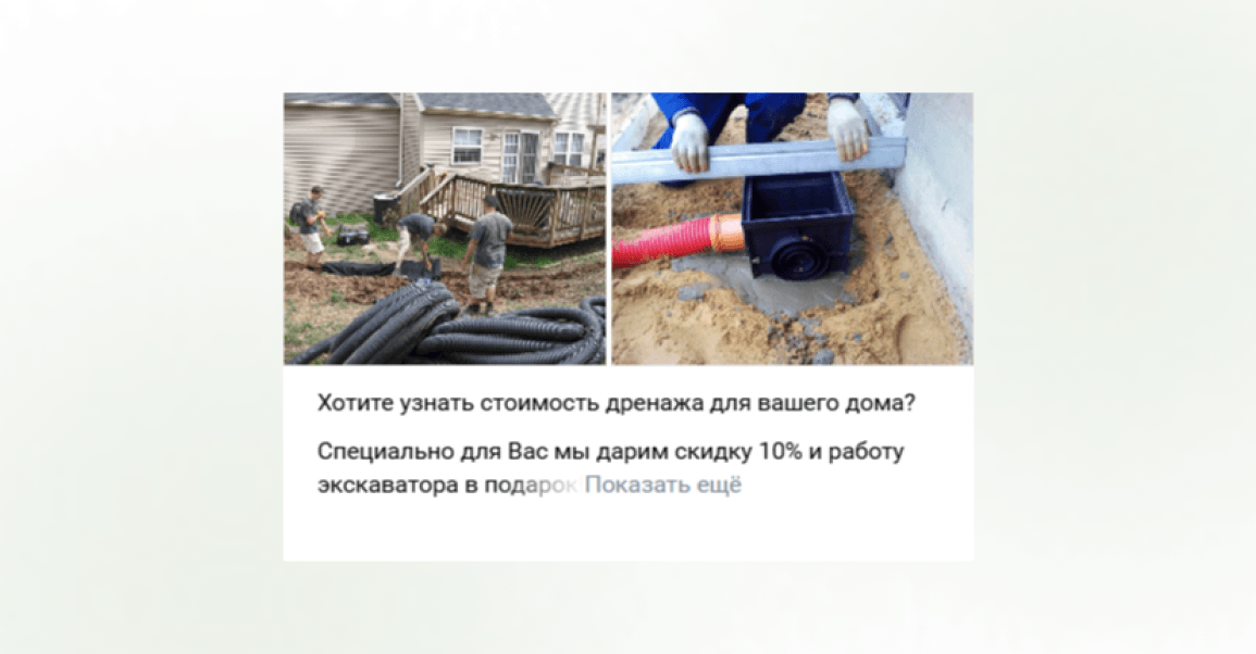 «Получите бесплатный расчёт стоимости дренажных работ и воспользуйтесь эксклюзивной скидкой 10% + работой экскаватора в подарок». Такой оффер мгновенно резонировал с целевой аудиторией, устраняя ключевые возражения (цена, выгода, объём трудозатрат).