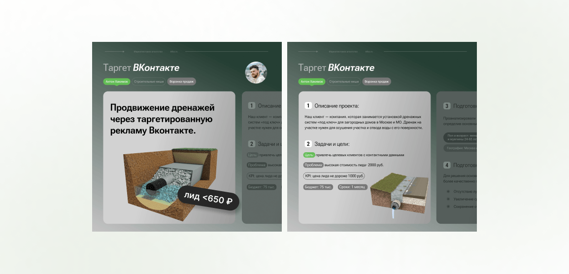 В креативах и текстах делался упор на типичные боли аудитории: постоянные лужи на участке, риск повреждения фундамента или гибели насаждений из-за застоя воды, невозможность комфортного отдыха на участке после дождя.