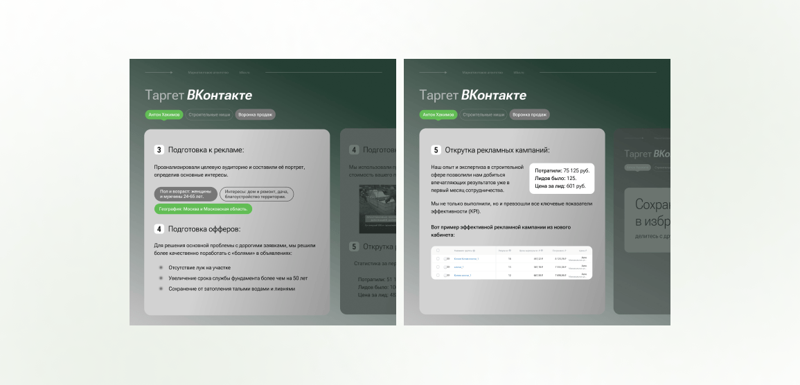 Для повышения конверсии агентство запускало кампании сразу в двух кабинетах VK: часть трафика направлялась в лид-форму, другая — на интерактивный опросник-квиз, который вовлекал пользователя и подогревал потребность в услуги.