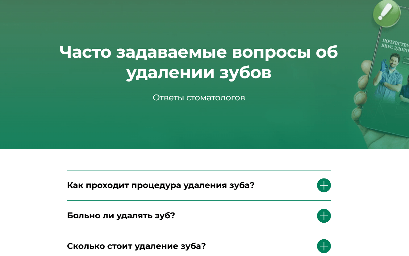 - Раздел «Вопрос-ответ» — снижает барьер страха у пациентов;