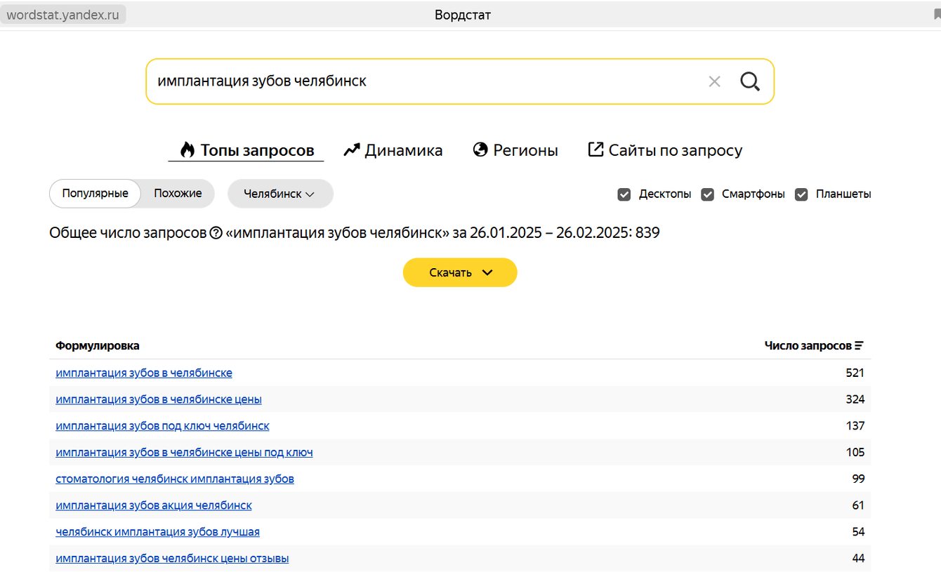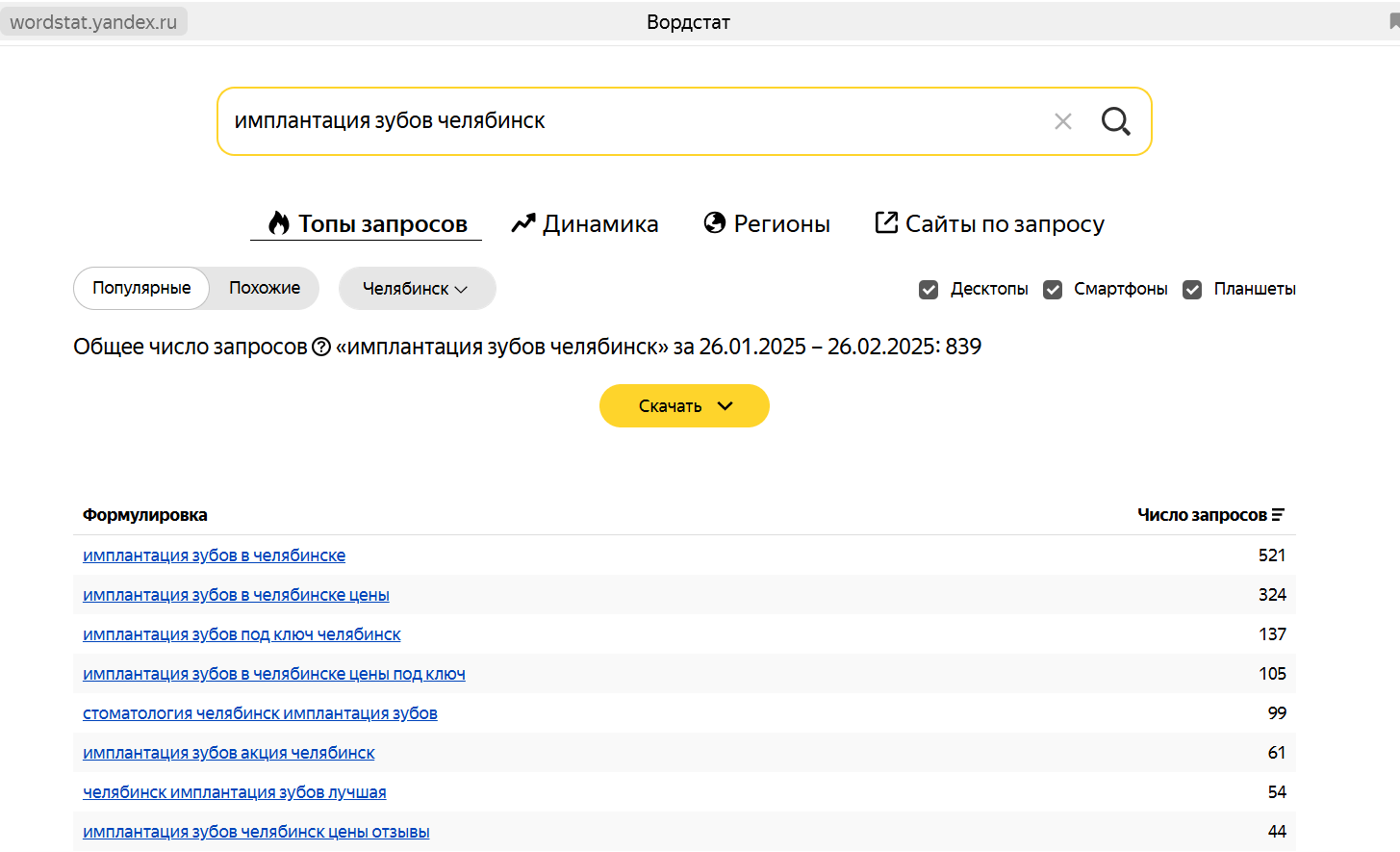 Собрали 25 запросов по стоматологии в Челябинске, разделив их на группы: