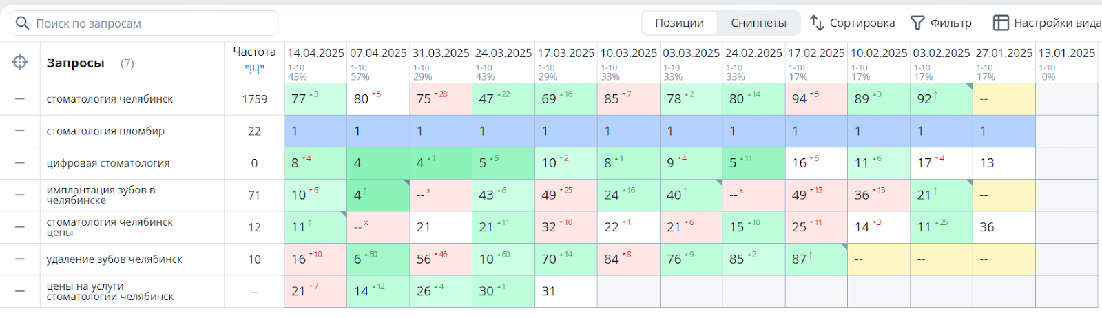 🔍 Запросы «Имплантация» и «Удаление зубов» пока за пределами ТОП-50 — работаем над релевантностью.