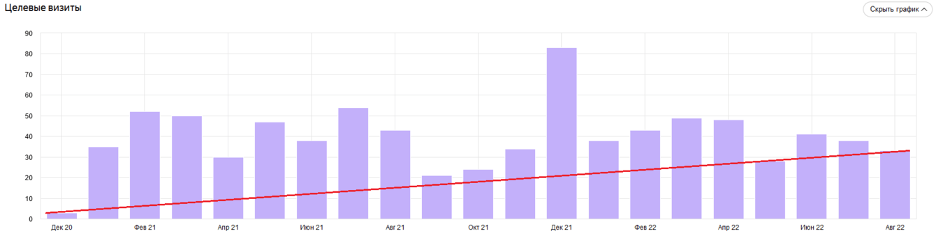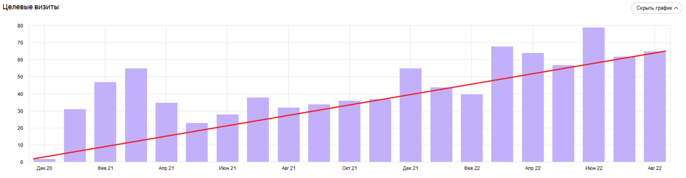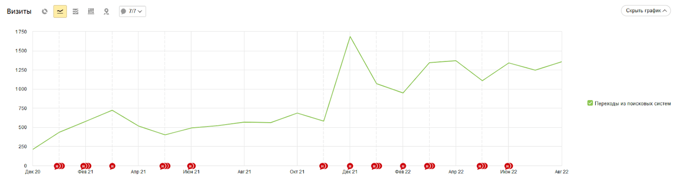 ➡️ В первый месяц продвижения (декабрь 2020 г.) трафик из поисковых систем составлял 211 визитов. Через 20 месяцев сотрудничества (август 2022 г.) посещаемость сайта составила 1 355 визитов.