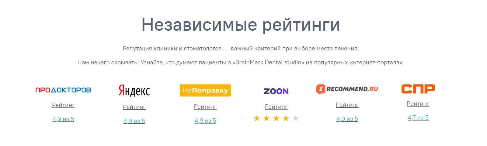 1. Добавлен блок «Независимые рейтинги» со ссылками на авторитетные источники с рейтингом компании BrainMark Dental Studio.