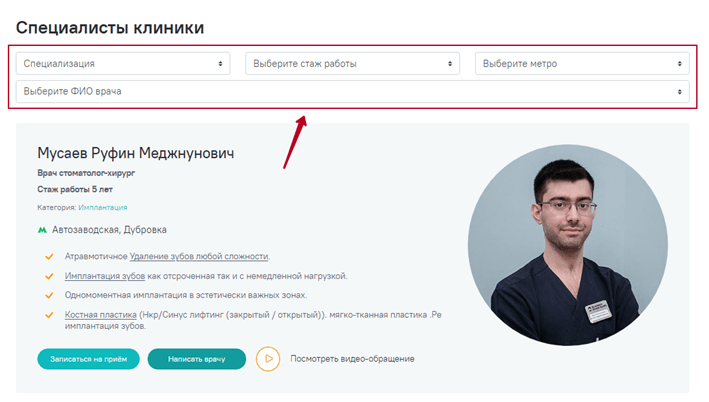 4. Раздел «Врачи» обзавелся удобным функционалом по поиску и подбору доктора. Фильтр помогает выбрать врача по специализации, стажу работы, местоположению, Ф.И.О.