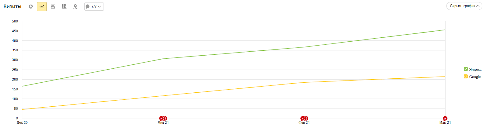 Уже после внесения первых правок трафик на сайт стал заметно расти. Спустя 3 месяца продвижения посещаемость ресурса увеличилась втрое.
