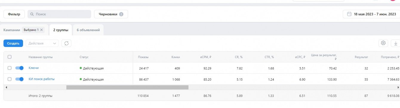 В каждой группе объявлений протестировано по 2 объявления, в процессе были оставлены те, что приносят отклики по меньшей стоимости.