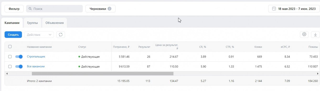 В начале работы была поставлена цель - отклики на вакансии для завода не дороже 300 р с НДС, цель достигнута и продолжает приносить заявки ежедневно.