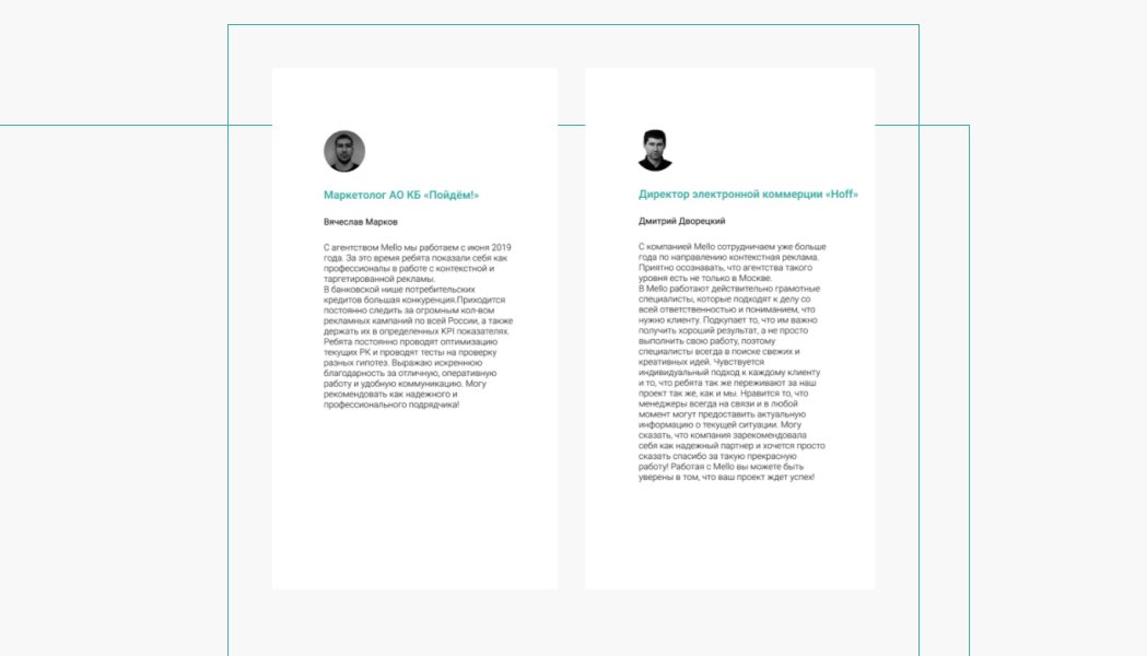 Следующим блоком, который закроет часть возражений клиентов при покупке, мы разместили виджеты. Здесь можно в один клик посмотреть отзывы об агентстве, узнать с кем мы работали, почитать кейсы сотрудников. Эти привлекательно-оформленные виджеты дают потенциальному клиенту продвинутся дальше на пути принятия решения о покупке. Пользователю не нужно писать в личные сообщения или звонить, на этапе, пока он не знаком с брендом. Виджеты помогают узнать больше о компании в несколько кликов.