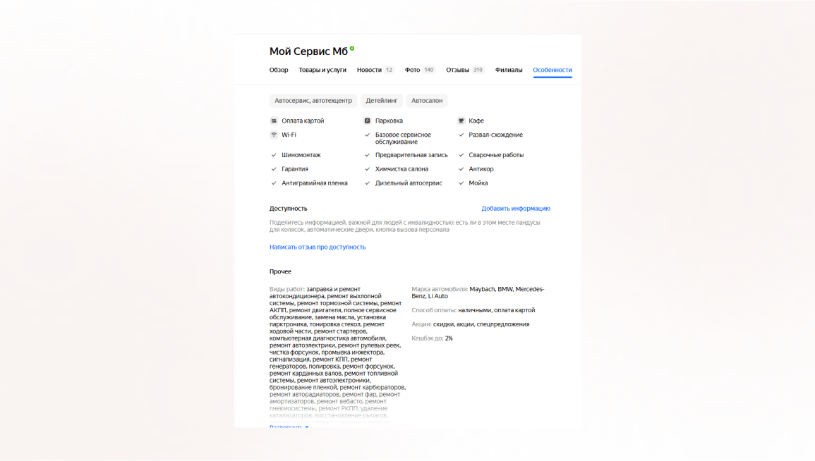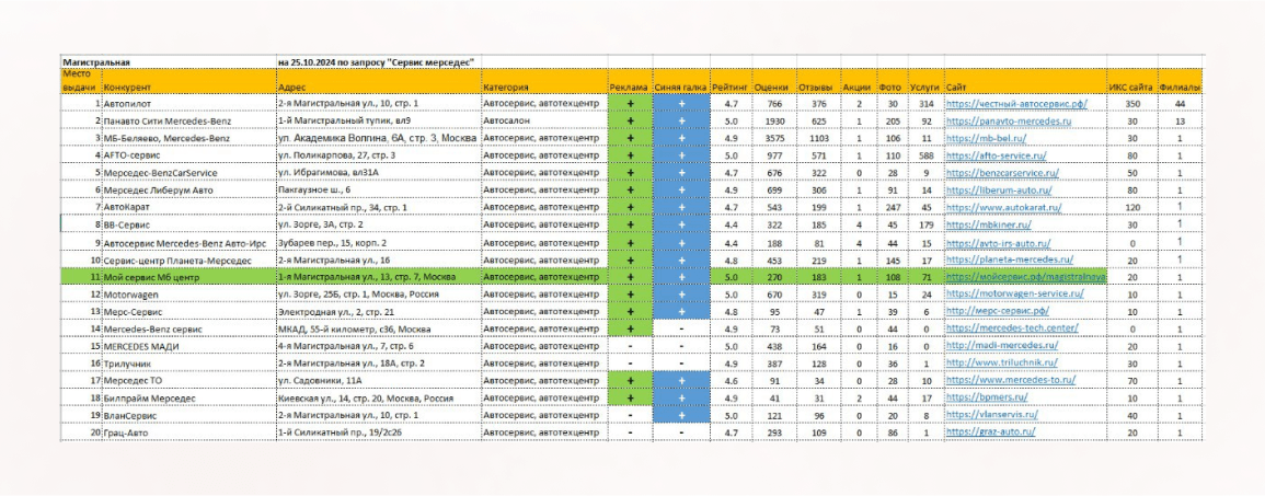 Проведен детальный анализ конкурентов на Яндекс.Картах. Мы изучили их категории, рейтинги, отзывы, описания, фотографии и другие важные параметры, чтобы выявить сильные и слабые стороны, а также определить возможности для повышения конкурентоспособности «Мой Сервис».