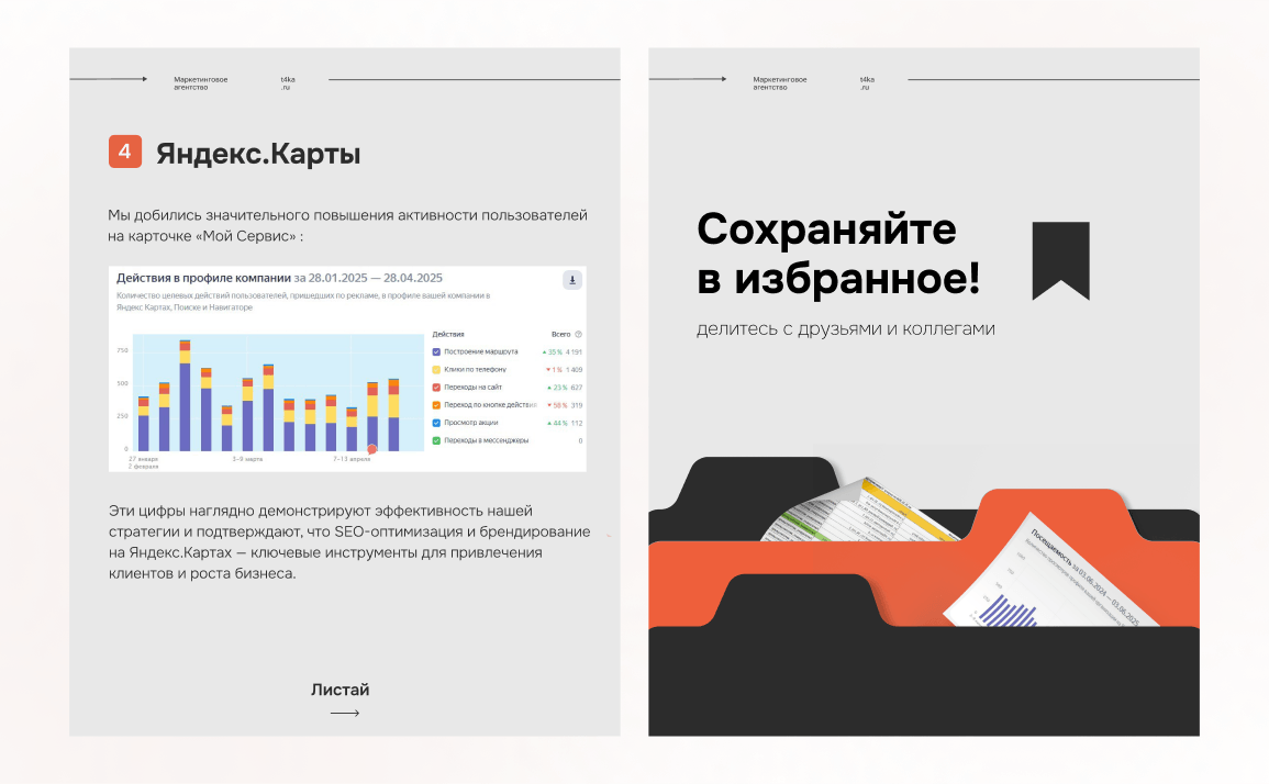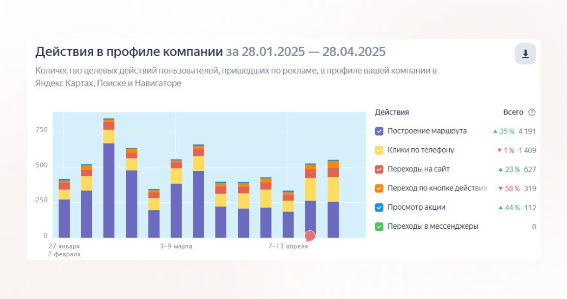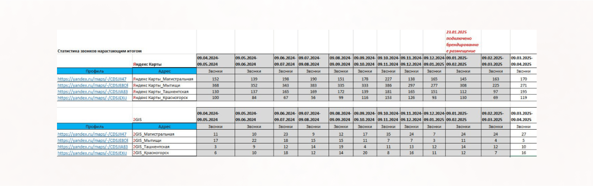 Плюс, мы оперативно реагируем на отзывы и регулярно обновляем информацию о компании, что повышает доверие и заметность. Но основной прирост трафика и лидов дали именно возможности брендированного размещения в Яндекс Картах.