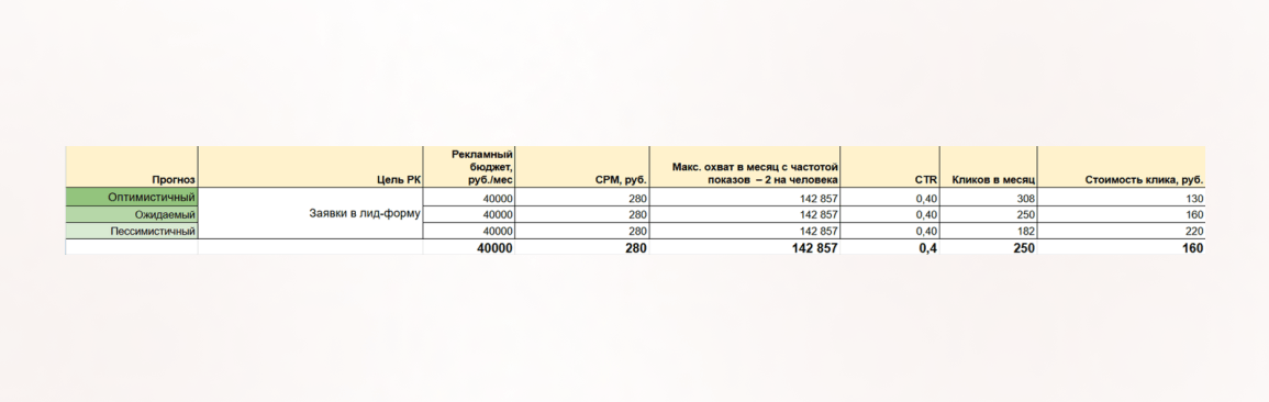 При подготовке медиаплана изучили конкурентов в сфере премиальных автосервисов по Московской области, учли прошлый опыт работы с «дорогой» аудиторией. В медиаплане рассчитали ориентировочную стоимость заявки и разделили прогноз на пессимистичный, ожидаемый и оптимистичный.