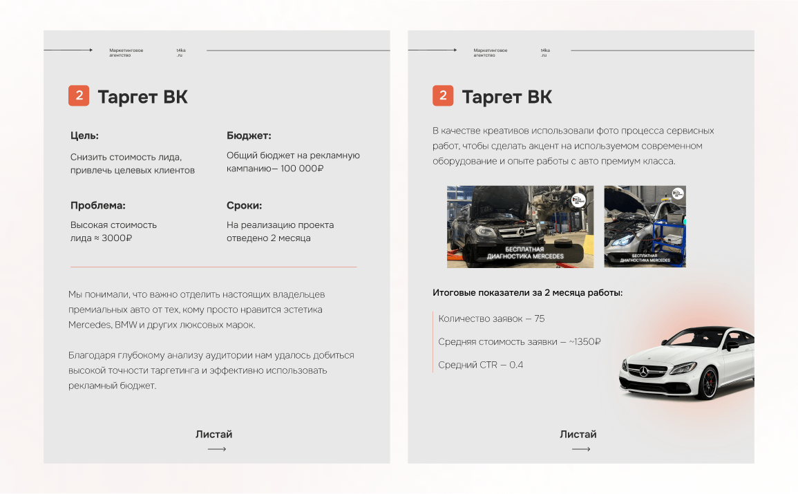 Для быстрого привлечения клиентов мы запустили и оптимизировали рекламные кампании в Яндекс.Директе. С помощью грамотного подбора ключевых слов и таргетинга на владельцев автомобилей Mercedes-Benz, BMW и LiXiang в Москве, мы достигли высокой эффективности рекламных кампаний, снизив стоимость привлечения клиента и увеличив количество заявок.