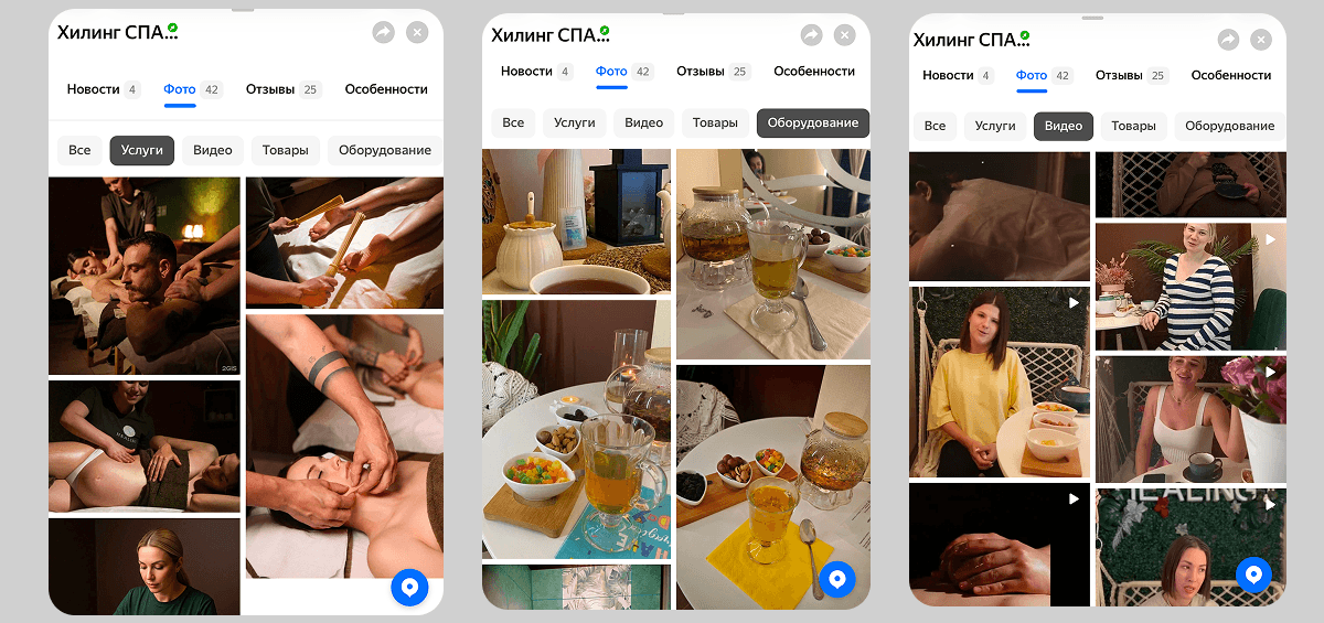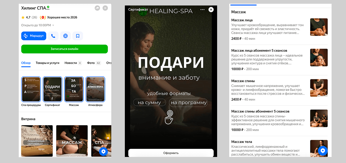 Со СПА работает тот же принцип: пользователь ищет не отдельную процедуру, а комплексное решение для отдыха и восстановления. Наша задача — сначала привлечь его в карточку салона, а затем с помощью информации, фотографий и описаний помочь выбрать подходящую программу.