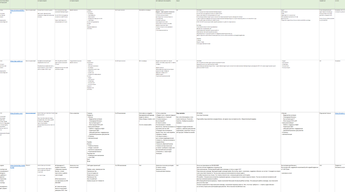 В результате я делаю большую таблицу со сравнением 8-10 конкурентов по 20+ параметрам. Для каждого клиента и каждой ниши параметры могут меняться и подбираться индивидуально.