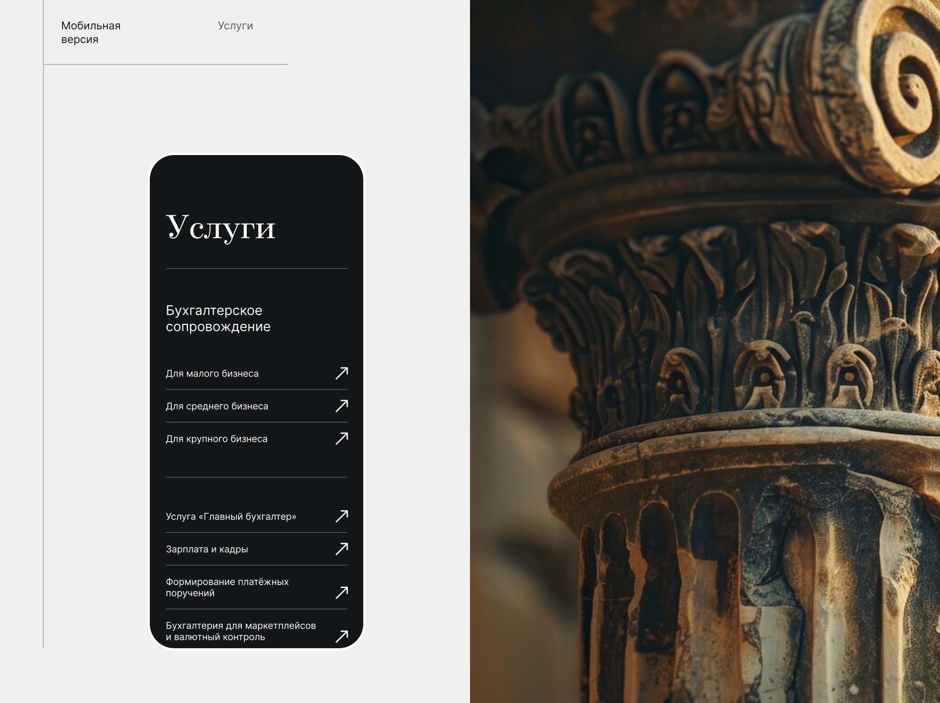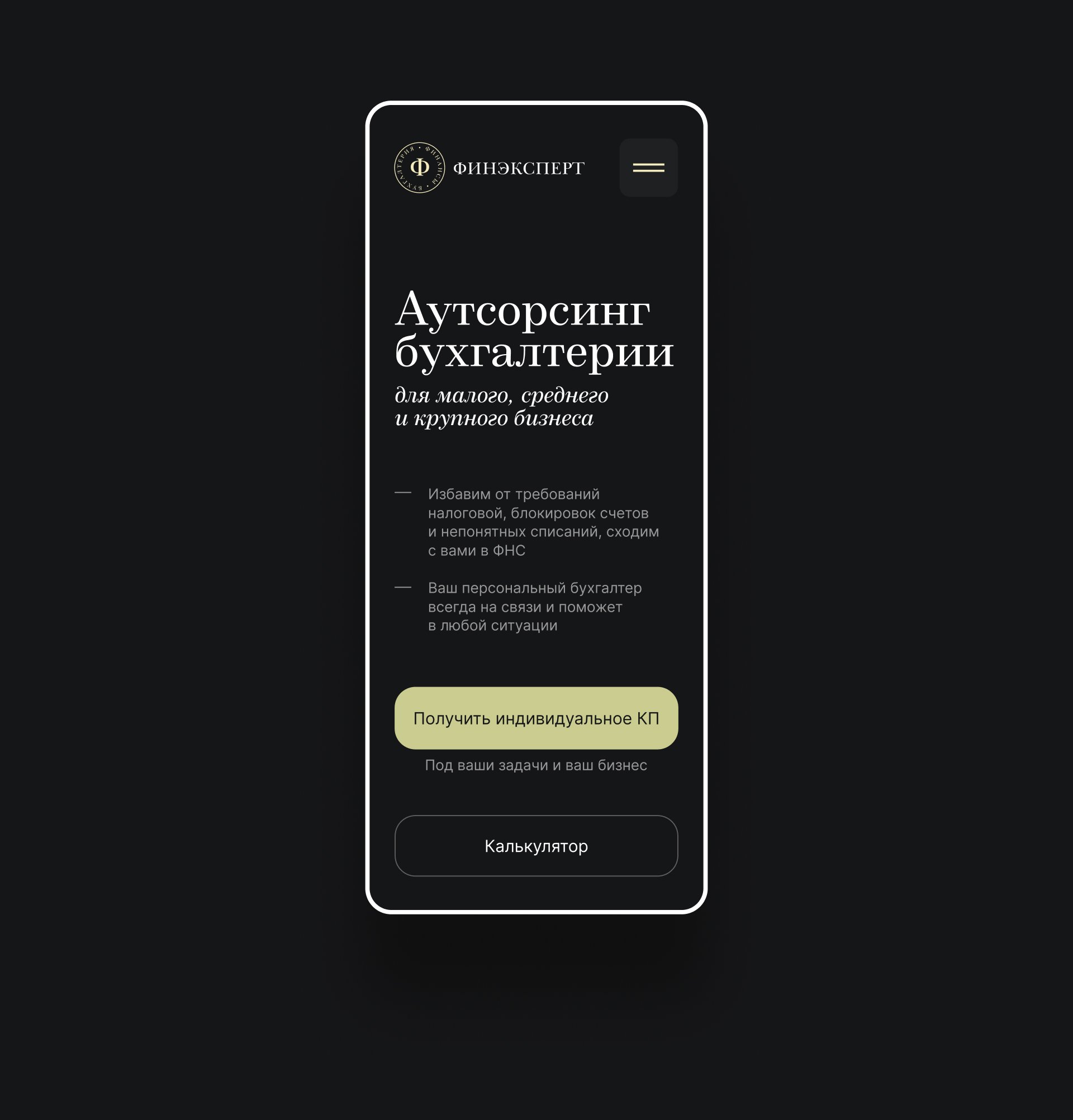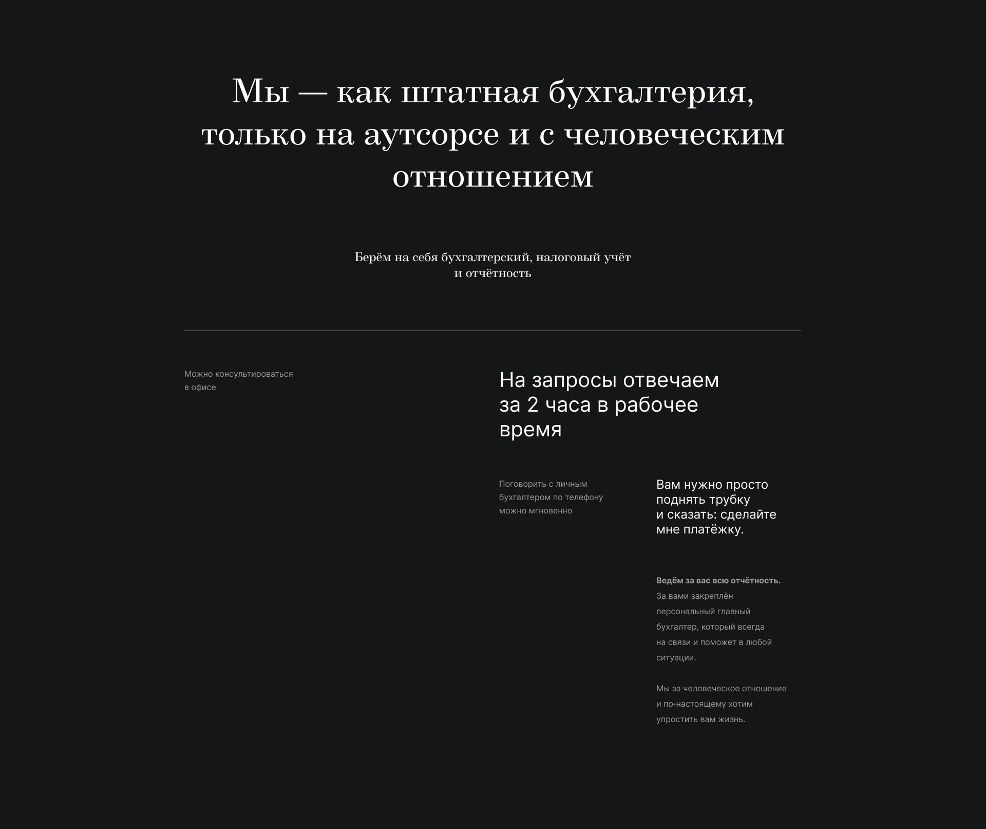 Сайт совершенно не передавал сильные преимущества компании и не создавал нужного впечатления. Шаблонные тексты на непонятном бухгалтерском, никаких выгод для клиента, дешевый и устаревший дизайн. Моей задачей стало исправить это и показать заботливое отношение компании к своим клиентам и уровень сервиса.