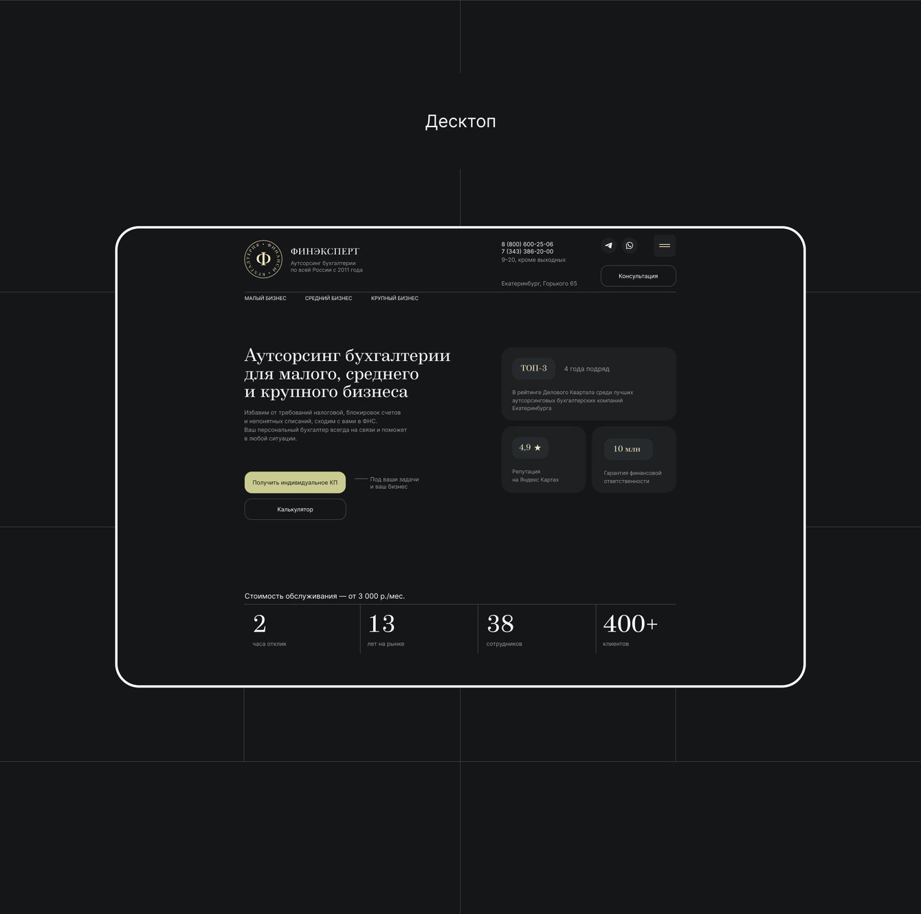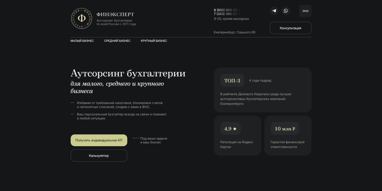 Клиент: компания по аутсорсингу бухгалтерии в Екатеринбурге. Входит в тройку лидеров в своем регионе. Компания предоставляет услуги по аутсорсингу бухгалтерии для малого, среднего и крупного бизнеса. И уделяют максимум внимания каждому клиенту.