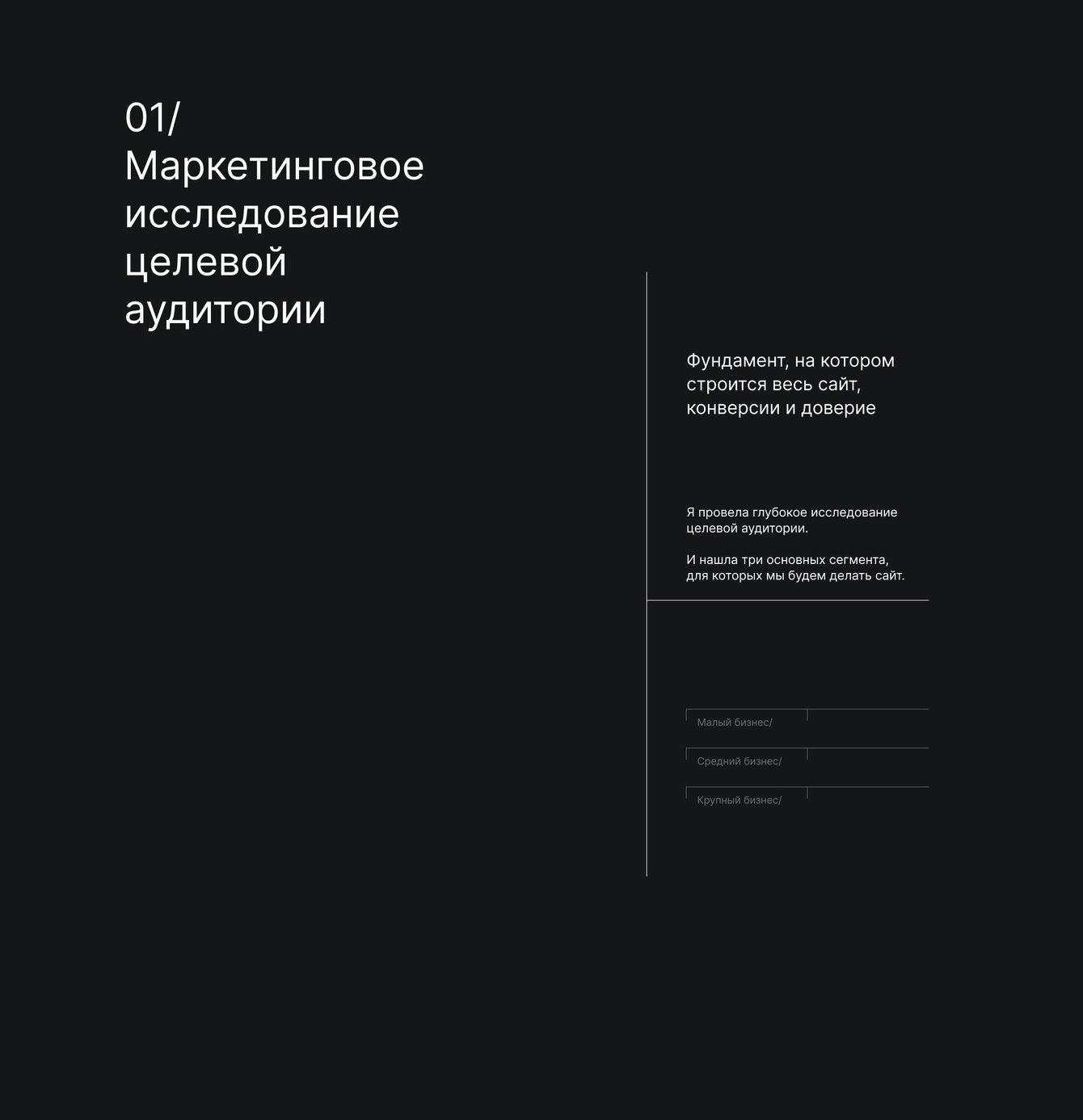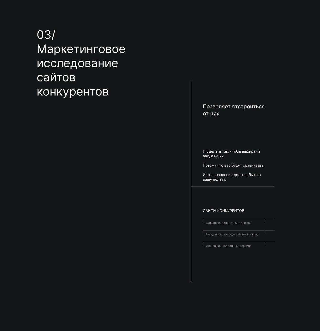 ✱ Отстроиться от конкурентов не только сильными текстами, но и дизайном. Практически у всех конкурентов сайты в светлых тонах. Мы отстроились от них, сделав сайт частично темным. Это сразу зацепит внимание при первом визите на сайт. Совокупно с оффером на первом экране.