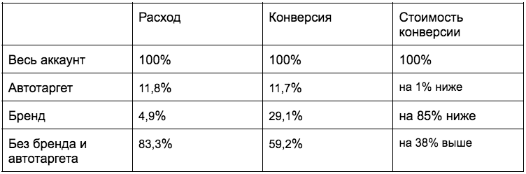 Автотаргет стал приносить 11% от общей эффективности, и, если сравнивать с другими рекламными кампаниями без бренда, то конверсии дешевле на 30%. Если смотреть по отдельным категориям, то стратегия автотаргета принесла эффективные результаты: