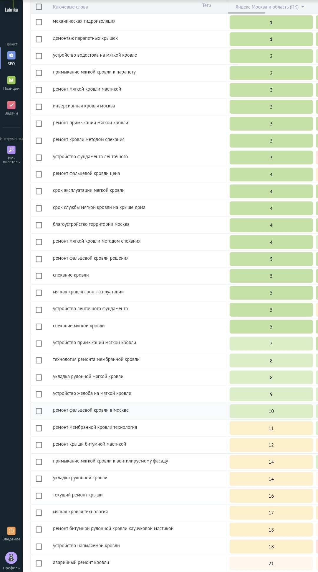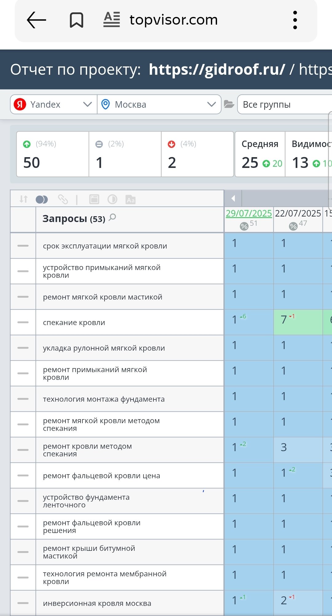 • Ключевые услуги («монтаж кровли», «капремонт») — вне топ-50 ❌