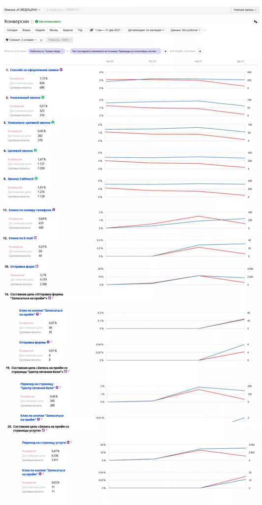 Провели анализ конверсий сайта за период работы над продвижением с сентября по декабрь. Анализ проводился по 20-ти целевым параметрам.