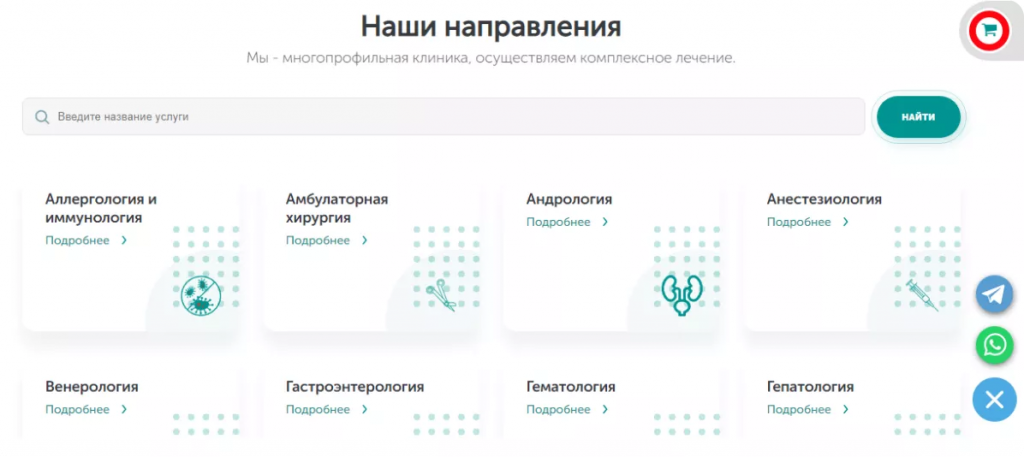 Многопрофильная клиника, которая оказывает большой спектр услуг, нуждалась в структурной и при этом наглядной подаче информации. Мы представили все услуги в специальном блоке. Отдельный блок посвятили видам диагностики, которая проводится в медицинском центре.