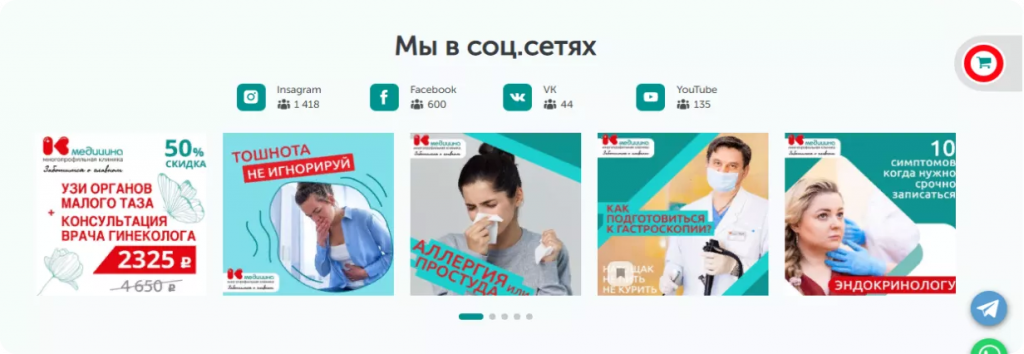 Иконки каждой соцсети кликабельны, что дает возможность пользователям перейти в интересующую сеть, чтобы узнать больше, неформально пообщаться там с представителями клиники, получить наиболее актуальную информацию, поговорить с реальными пациентами, уже посетившими медицинский центр. Все это работает на повышение лояльности к клинике, дает возможность целевой аудитории начать больше доверять ее врачам.