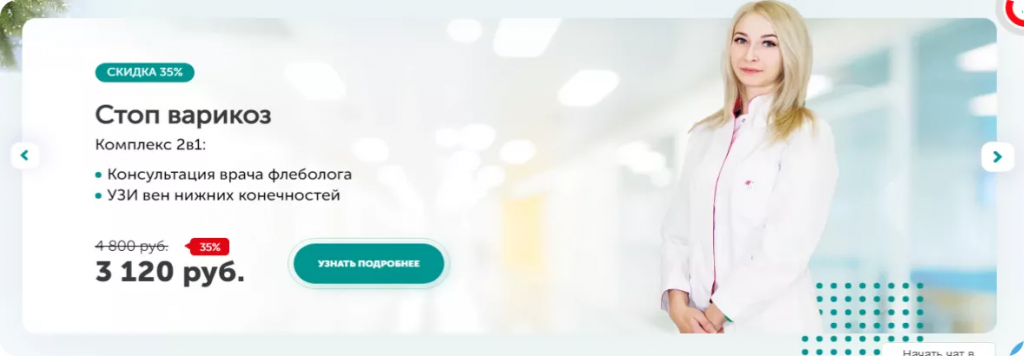 На главной странице сайта мы разместили блок с актуальными скидочными предложениями, который позволит привлечь внимание пользователей, расскажет о самых “горячих” предложениях и будет выполнять мотивирующую функцию, побуждая записаться на консультацию к врачу прямо сейчас.