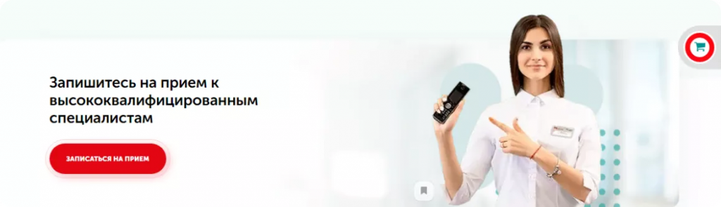 Мы разместили кнопки записи на прием в шапке сайта, а также посвятили этому блоки в середине и в конце главной страницы. Это ненавязчиво подталкивает будущих клиентов клиники к совершению целевого действия, позволяет записаться на консультацию в режиме онлайн, не тратя много времени.