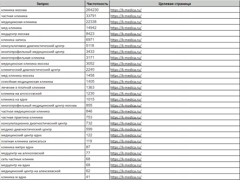 Для каждой медицинской услуги был подобран свой набор ключевых запросов, которые набирали пользователи в поисковых системах Яндекс и Google. Кластеризация (разделение ключевых слов на группы по их значению, схожести поисковой выдачи по запросам) проводится на основе анализа спроса и тематики каждой отдельной целевой страницы сайта. При группировке запросов в кластер учитывается не только семантическая схожесть ключевых фраз, но также по каждой отдельной поисковой фразе проводится анализ конкурентной выдачи, на основании которого определяется итоговая принадлежность запроса к тому или иному кластеру. Пример кластера целевых запросов для главной страницы ресурса: